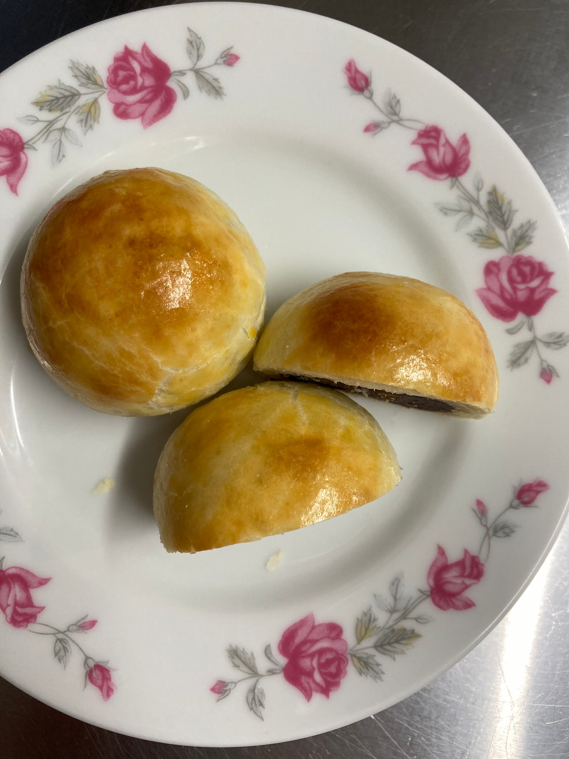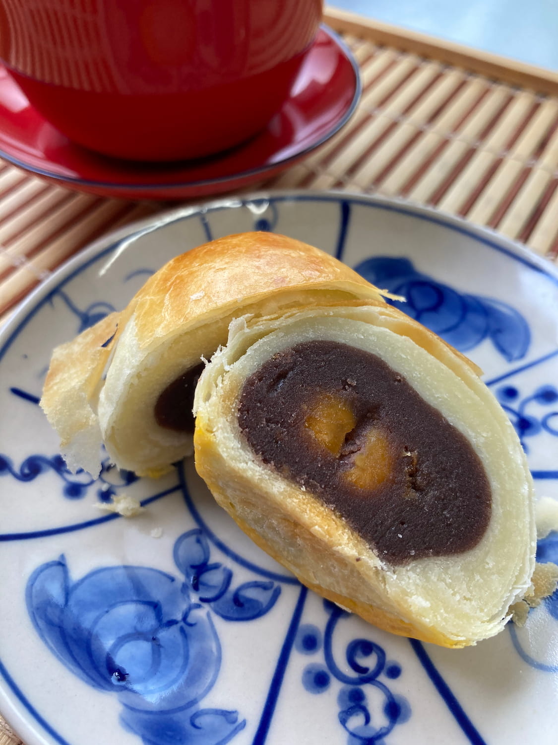小豆餡の甘み中に塩漬け卵黄のコクが美味しいパイ生地のお菓子です。